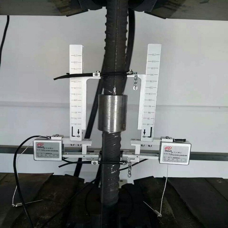3、雙側(cè)引伸計(jì)和鋼筋之間只有采用彈性連接(例如:彈簧和皮筋套),這樣測(cè)量得到的數(shù)據(jù)才是最可靠的。多次實(shí)驗(yàn)證明:采用機(jī)械式剛性連接雖然連接方便,但是測(cè)量的數(shù)據(jù)誤差大,大于1%,重復(fù)性差,數(shù)據(jù)不可靠,不能通過(guò)計(jì)量檢定。