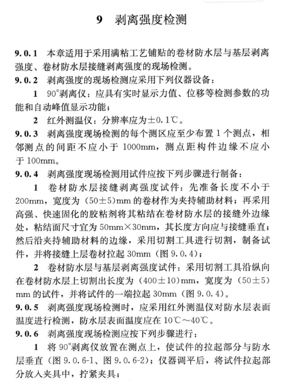 剝離強度現(xiàn)場檢測時,應(yīng)采用紅外測溫儀對防水層表面溫度進行檢測,防水層表面溫度應(yīng)在10~40度